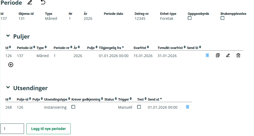 Bildet nedenfor viser en periode med tilhørende pulje og utsending. Nederst i skjermbildet kan du angi antall nye perioder og starte opprettelsen:
